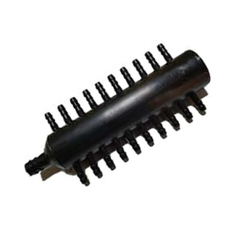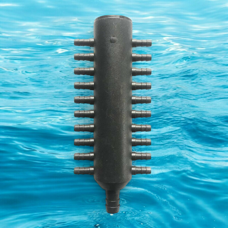 Гребенка на 20 выходов также широко применяется для аэрации прудов. Благодаря двадцати-канальному распределителю воздуха, у вас появляется возможность установить как минимум двадцать распылителей воздуха, а использовав еще 20 тройников - можно установить до 40 распылителей одновременно. Такой вариант возможен только при использовании профессиональных и мощных компрессоров.