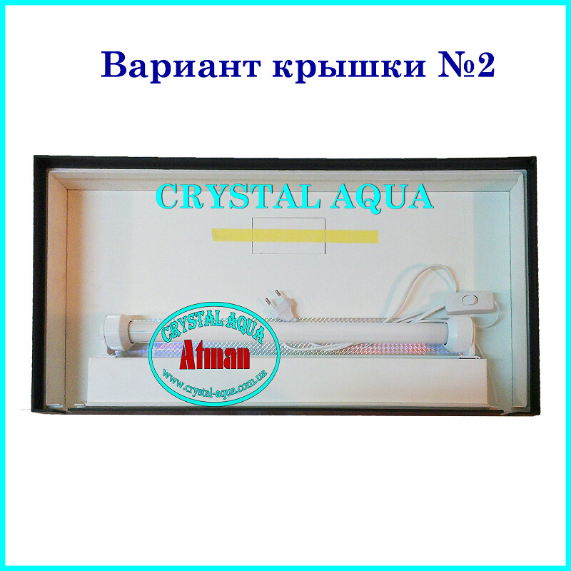 Вариант №2) По периметру крышки, во внутренней ее части, приклеена пластиковая окантовка, которая при установке крышки на аквариум, ложится во внутреннюю часть аквариума. По периметру крышки с внешней ее стороны, приклеена декоративная окантовка, которая при установке крышки на аквариум, маскирует уровень воды в аквариуме и ребра жесткости . При такой технологической сборке исключается течь конденсата по стенкам аквариума и проникновение лучей света из под крышки-светильника. Сама же крышка съемная целиком.